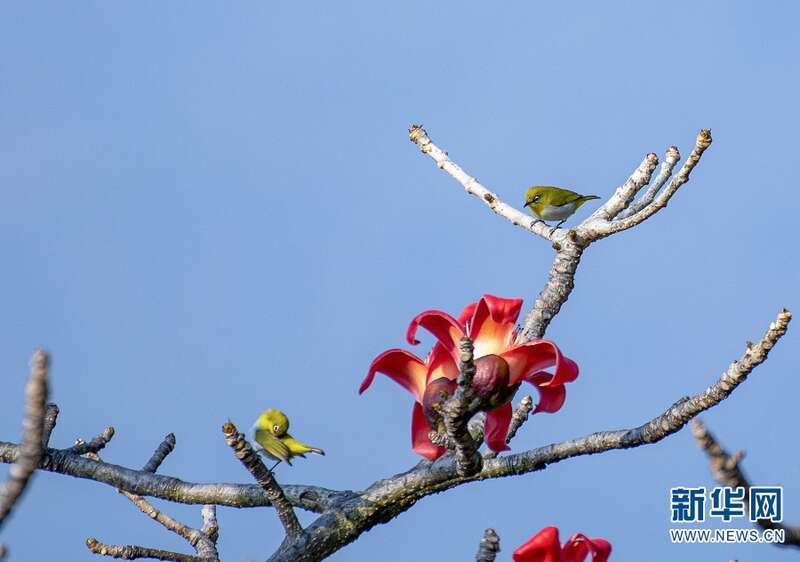 保山市隆阳区,两只小鸟停留在木棉树枝头,鸟儿绿色的羽毛与木棉红色的花朵相映成趣(摄于2月27日)。新华网发(郭康/摄)