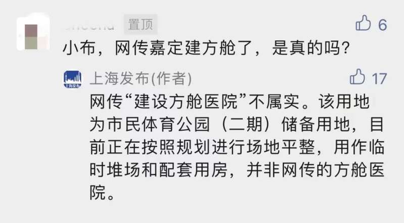 针对“嘉定建方舱医院”,上海发布表示“该用地为市民体育公园(二期)储备用地,目前正在按照规划进行场地平整,用作临时堆场和配套用房,非网传的方舱医院”。