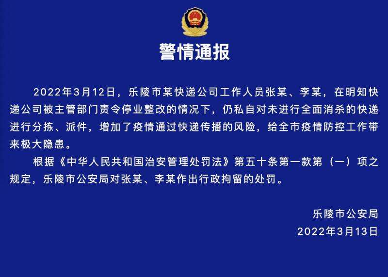 据山东德州乐陵市公安局消息,2022年3月12日,乐陵市某快递公司工作人员张某、李某,在明知快递公司被主管部门责令停业整改的情况下,仍私自对未进行全面消杀的快递进行分拣、派件,增加了疫情通过快递传播的风险,给全市疫情防控工作带来极大隐患。