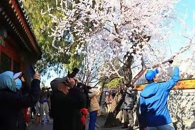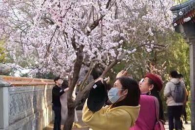 北京:北海公园山桃花绽放 再现“春花绕白塔”美景