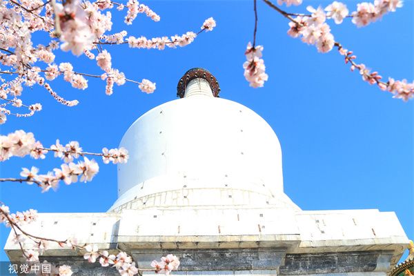 2022年3月14日,北京,北海公园山桃花、玉兰花绽放,再现春花绕白塔的美景。