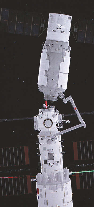 在北京航天飞行控制中心拍摄的空间站机械臂转位货运飞船试验画面,天舟二号货运飞船在机械臂拖动下,以核心舱节点舱球心为圆心进行平面转位。新华社记者 郭中正摄