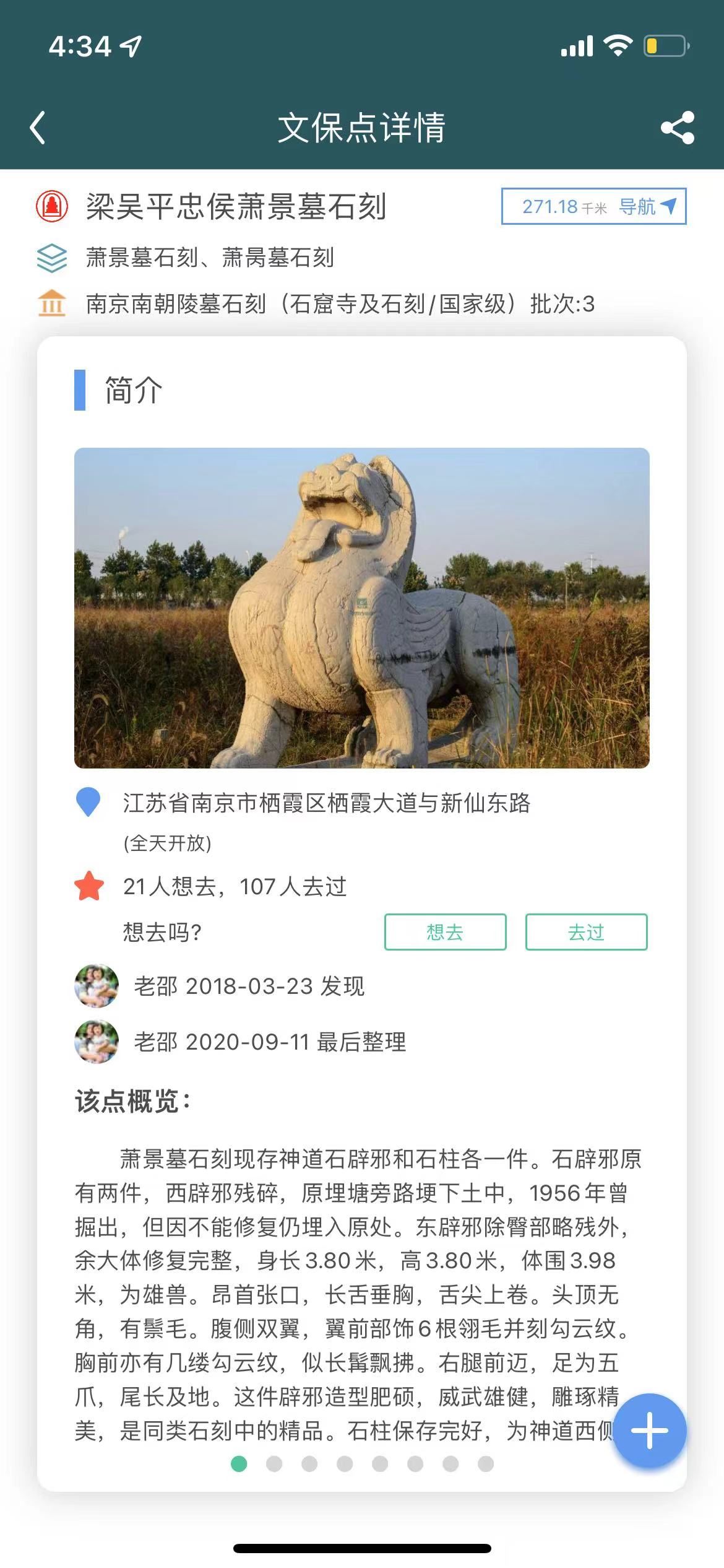 王腾:华古的全称是“华夏古迹图”,它是一个“互联网+文物古迹”的数据平台。2014年时,因为我们在南京的几个朋友都有去野外看文保的爱好,而我们又都有共同的精神导师:八十年前朱偰先生和他写作的“金陵考古三种”——《金陵古迹图考》《金陵古迹名胜影集》和《建康兰陵六朝陵墓图考》。在他的影响和激励下,我们组成了一个小组,用了两年时间,几乎利用所有的周末,把南京和周边地区的文保,像普查一样,一个个地看过来。