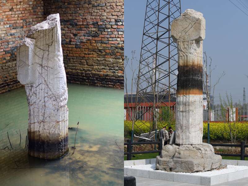 左图:抬升前的萧暎墓石柱,右图:抬升后的萧暎墓石柱
