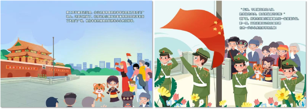 该绘本以彝族姑娘阿依和小小虎第一次走出大山,去天安门广场看升旗为主要内容,讲述了他们经过祖国多个地方,最终到达北京。在日出之时和各族人民一起在天安门广场观看升国旗、奏唱国歌的故事。
