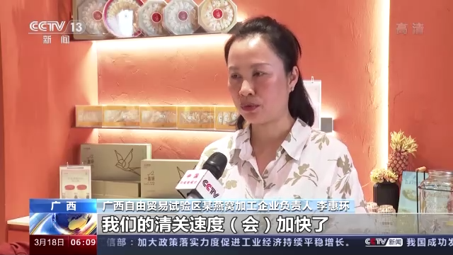 广西自由贸易试验区某燕窝加工企业负责人 李惠环:RCEP对马来西亚生效后,我们的清关速度会加快,从原先的10天减少到7天,那么我们的仓储和物流的成本得到降低。
