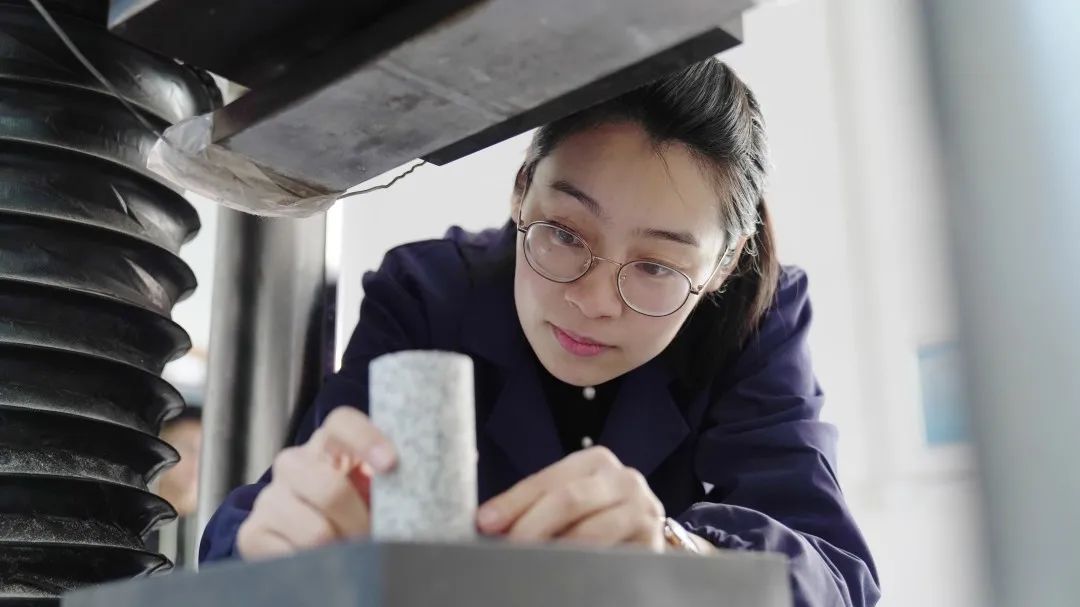 走进中南大学岩石力学实验室,成堆的石料中, 扎着干练马尾、长相清秀、身着满是灰尘的深蓝色实验服的黄麟淇,正带着一群研究生仔细观察着一块破碎石灰岩样本的碎裂走向和横截面纹理。 他们利用机械不断给岩石施加重压,模拟深井矿山中不同种类岩石遭受巨大压力时的岩爆机制,探索出矿山灾害防控的最佳方案, 为矿工生命安全保障撑起一道保护伞。