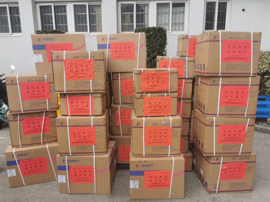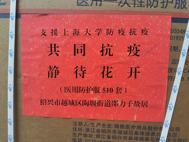 绍兴市越城区陶堰街道全力筹措防疫用品,心系学校师生,捐赠一批防护服、隔离手套、隔离面罩等物资。