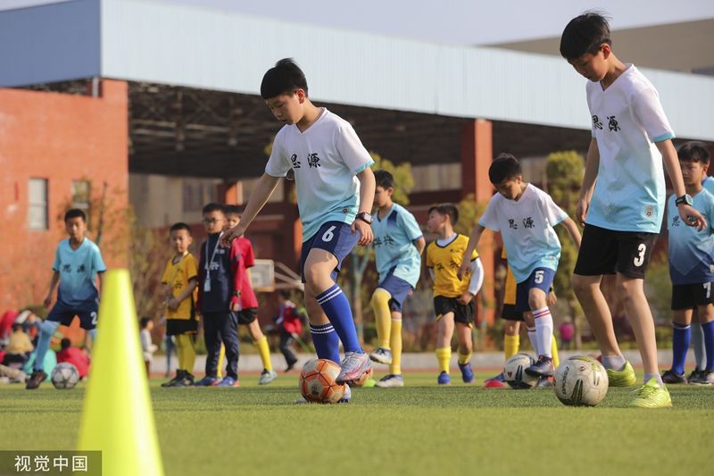 2022年3月18日,湖南省邵阳市隆回县思源实验学校足球社团的学生在练习足球。