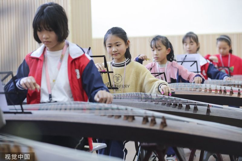 2022年3月18日,湖南省邵阳市隆回县思源实验学校古筝社团的学生在练习古筝。