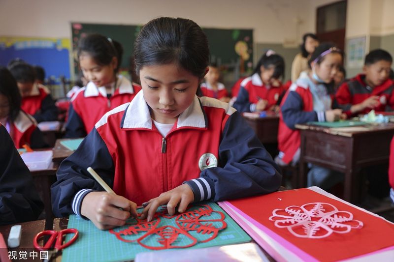 2022年3月18日,湖南省邵阳市隆回县思源实验学校剪纸社团的学生在练习剪纸。