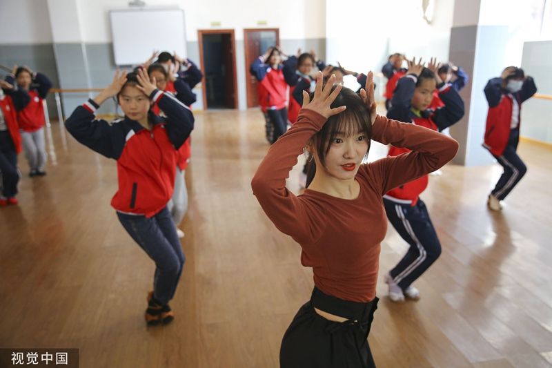 2022年3月18日,湖南省邵阳市隆回县思源实验学校拉丁舞社团的老师带领学生在练习拉丁舞。