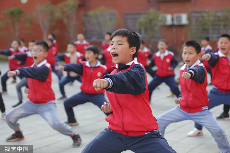 2022年3月18日,湖南省邵阳市隆回县思源实验学校武术社团的学生在练习武术。