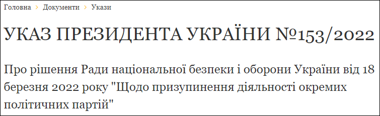 据乌克兰总统办公室网站当地时间3月19日发布的另一份声明显示,乌克兰国家安全与国防委员会于当天作出决定,暂停11个“与俄罗斯有联系”的乌克兰反对党的活动,这其中就包括了乌克兰议会第二大党派“反对派平台-为了生活”党(Opposition Platform - For Life)。