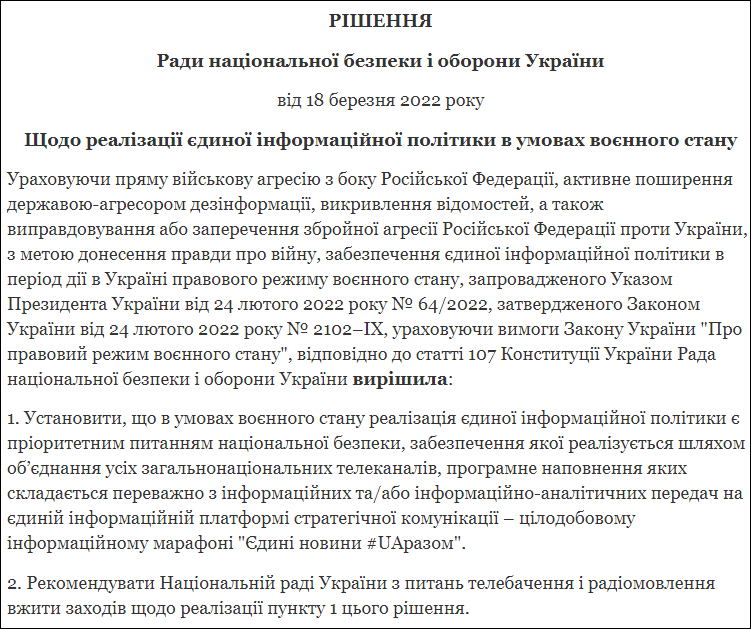 声明称,“考虑到俄罗斯联邦的直接军事攻击,侵略国积极散布虚假情报,歪曲信息,以及为俄罗斯联邦对乌克兰的武装侵略辩解”,根据当前乌克兰“戒严法”以及宪法第107条等法律规定,乌克兰国家安全与国防委员会作出以下决定: