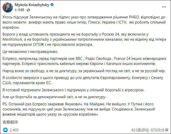 克尼亚日茨基在脸书上称:“有人推动泽连斯基签署一项法令,批准了国家安全和国防委员会的决定,这是非法和不公平的。人民为‘自由’而战,而不是为‘独裁’。我将亲自向欧洲议会、美国国会所有议员以及欧盟国家的议员谈论这一问题。”