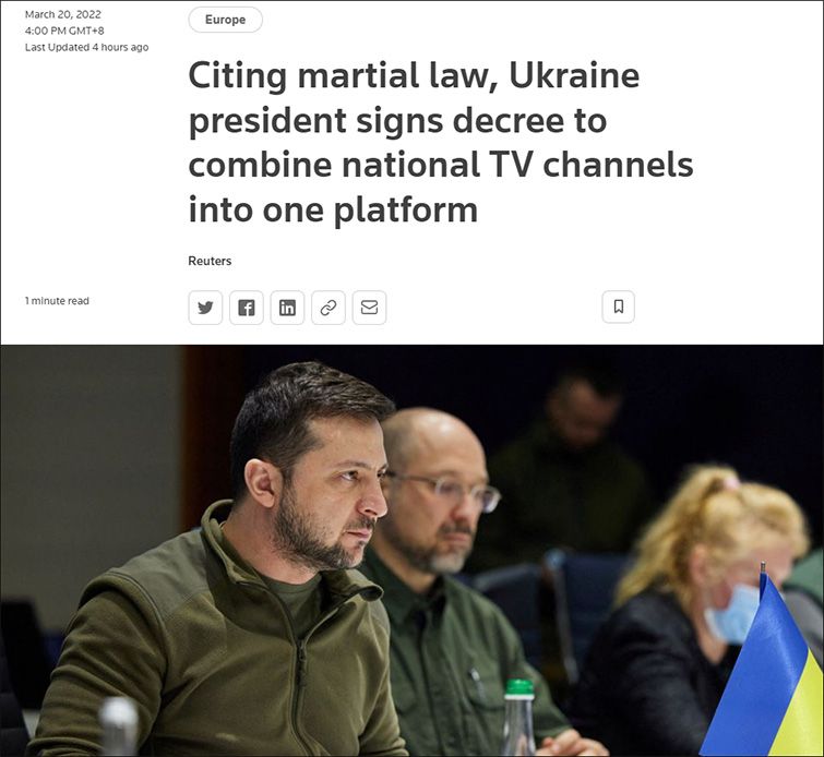 【文/观察者网 熊超然】当地时间3月19日,乌克兰总统办公室发布一份声明称,乌克兰总统泽连斯基已经签署一项法令,将国内所有国有电视频道统一合并为一个平台,原因称与当前戒严令下“统一信息政策”的重要性有关。