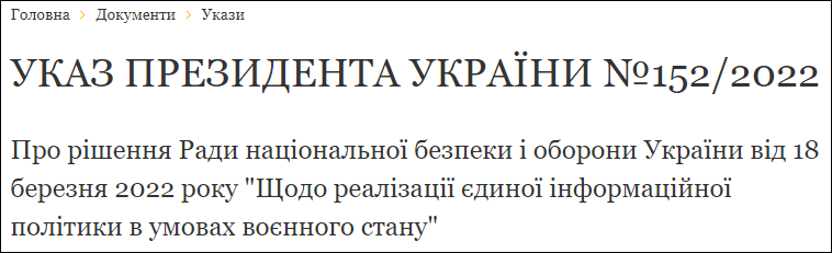 乌克兰总统办公室网站当地时间3月19日发布的这一声明,共分为两个部分。第一部分公布了“第152/2022号”乌克兰总统令,内容是乌克兰国家安全与国防委员会(NSDC)3月18日“关于战争条件下实施统一信息政策”的决定。
