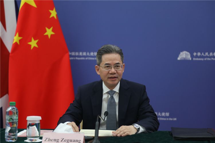 2022年3月22日,中国驻英国使馆举办纪念中英建立大使级外交关系50周年座谈会。中国驻英国大使郑泽光,中国政府欧洲事务特使吴红波,中国人民对外友好协会副会长姜江,英国外交发展部中国和东亚司司长卓丹廉,英国议会上院议员戴维逊勋爵、下院议员伯恩,英国前商务大臣凯布尔,四十八家集团俱乐部主席佩里,英中贸协主席古沛勤,英中协会主席戴维信,来自英国工商、文化、教育、科技等各界代表,以及华人和中国留学生代表以线下线上方式参加座谈会并发言。郑泽光大使作了题为《砥砺前行 协力共创更好未来》的讲话,全文如下: