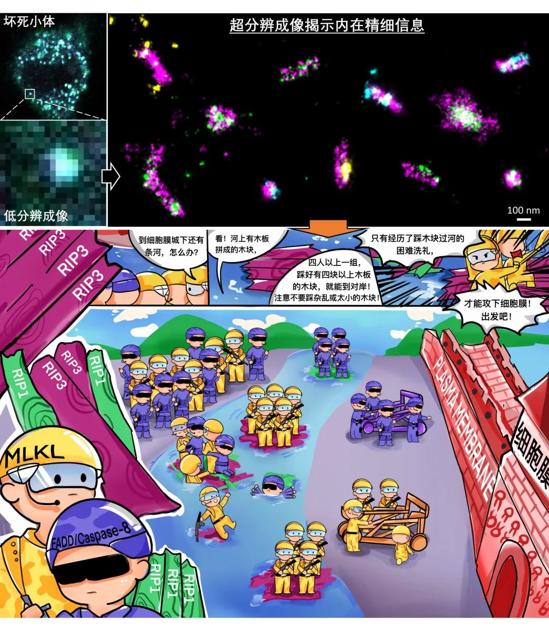 回到上述的漫画示意图,死亡细胞中的坏死小体由初始点团样结构演化为规则的棒状结构的组装模式,并且在该规则棒状结构中呈现出明显的由RIP1/RIP3组成的马赛克状分布。当MLKL四人成团,找到四块以上RIP3木块,就能越过“坏死小体”河流,进而靶向细胞膜,导致细胞死亡发生。