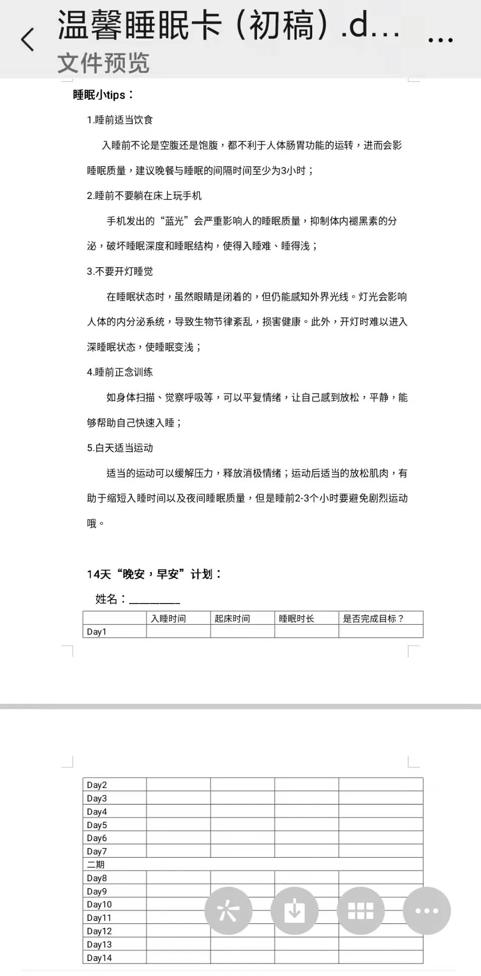 他们也希望活动不只是对同学们产生一时的吸引,更希望能够帮助大家建立长久的习惯。“我们在校园里设置摊位,给大家发睡眠温馨卡。卡片正面是一些睡眠知识,对面是一个打卡的表格。大家拿到这个睡眠健康卡后,设定自己在睡眠时间上的小目标,坚持打卡14天。我们后续会通过线上的形式进行统计,给坚持打卡的同学发放奖励,希望帮助和督促大家能够坚持下来这项有益的活动!”