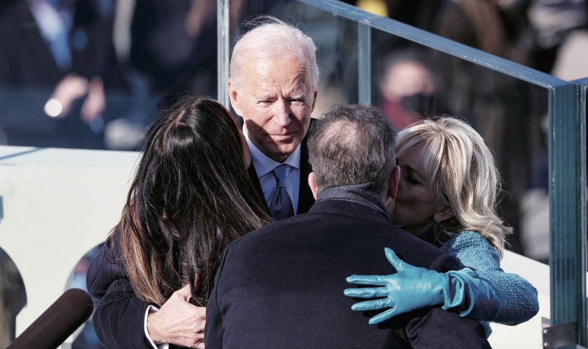 2021年1月20日,美国华盛顿,拜登宣誓就任美国第46任总统后,拥抱妻子吉尔、儿子亨特和女儿阿什利。图片来源 视觉中国