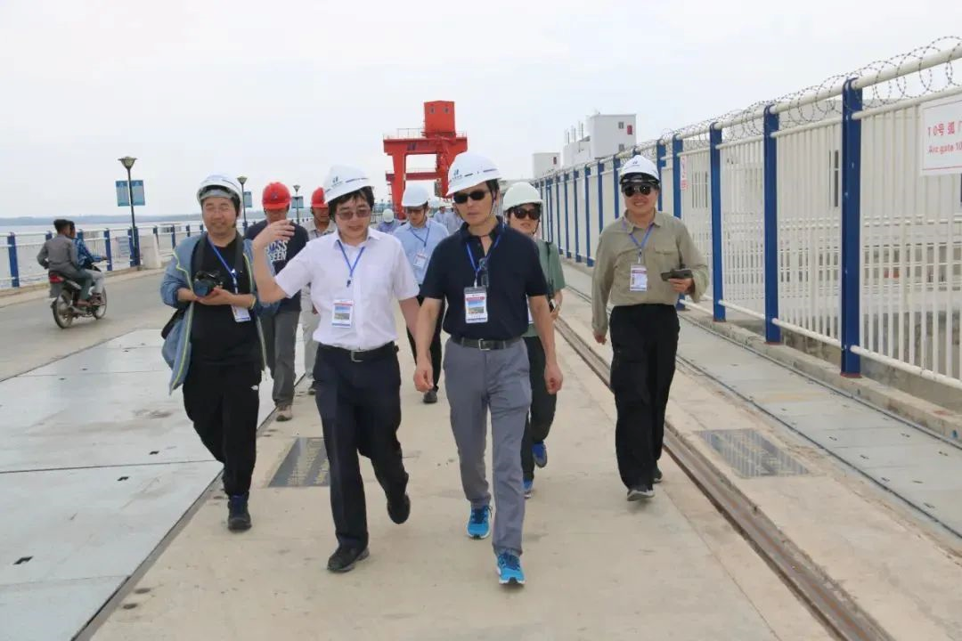汤秋鸿(左2)与团队考察柬埔寨境内最大水电工程——华能桑河二级水电站运行情况