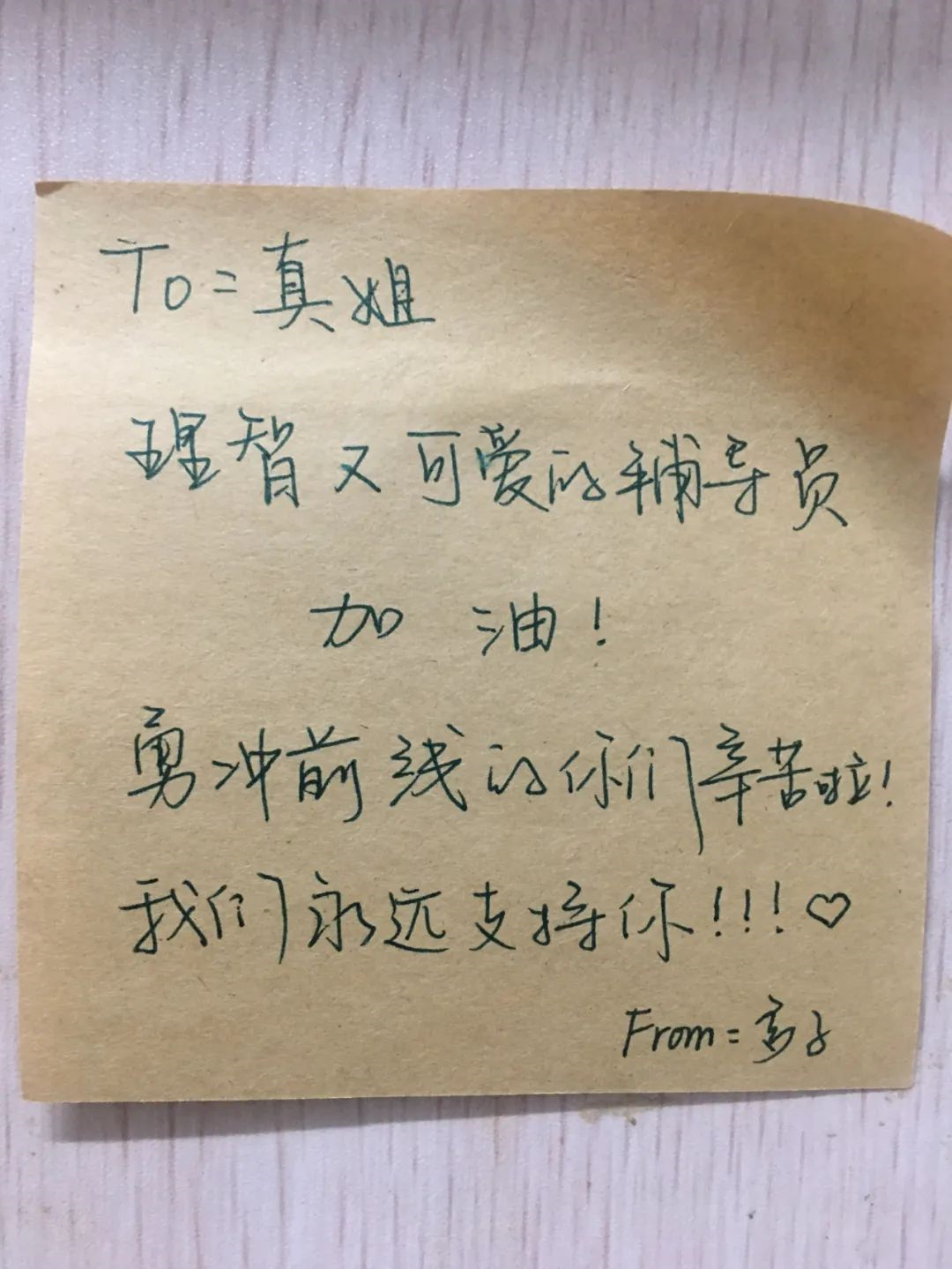 “目前同学们学习生活情况总体良好稳定,我能给予她们的不多,反倒是学生们给予我更多支持,回到学生宿舍当天学生们在年级群告诉我‘好有安全感,辛苦了!’并给我送来了生活物品,里面附了一张便利贴:勇冲前线的你们辛苦啦!我们永远支持你!!!”