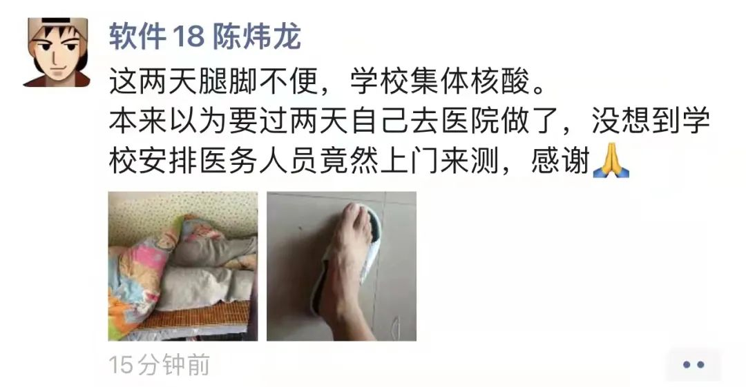 前几日,计算机工程学院陈炜龙同学运动时不慎受伤,得知情况的辅导员郑文萃,马上赶到学校,顺利为受伤的同学进行了消毒和包扎。“辅导员晚上专门来学校帮我包扎伤口,医疗中心特地协调医护人员来宿舍为我做核酸,这让我体会到家的温暖。”