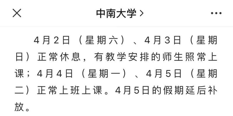 南宁师范大学:4月2日、3日(星期六、星期天)正常休息。4月4日—6日正常上班上课,假期调整至暑假。