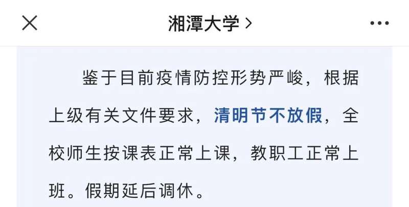 曲阜师范大学:2022年4月2-5日正常按校历执行周末和工作日教学安排,4月5日清明节假期顺延至暑假补足。