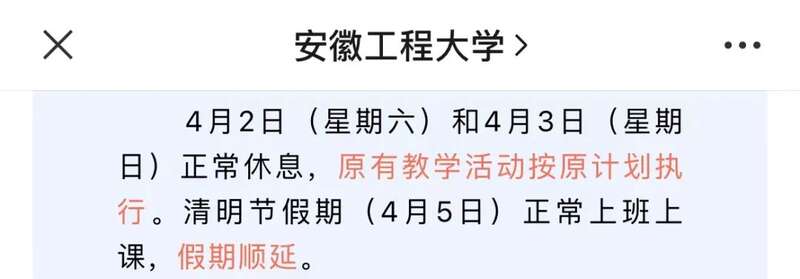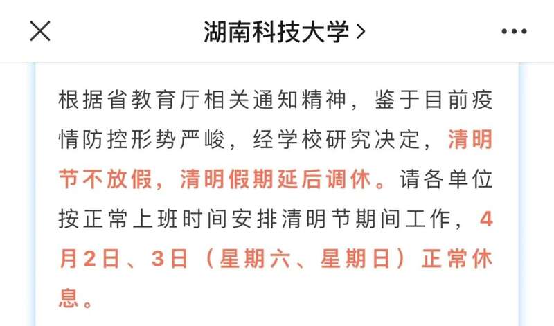 广西科技大学:4月2日(星期六)、4月3日(星期天)休息,4月4日、5日、6日正常上班上课。假期调整到2022年暑假安排。