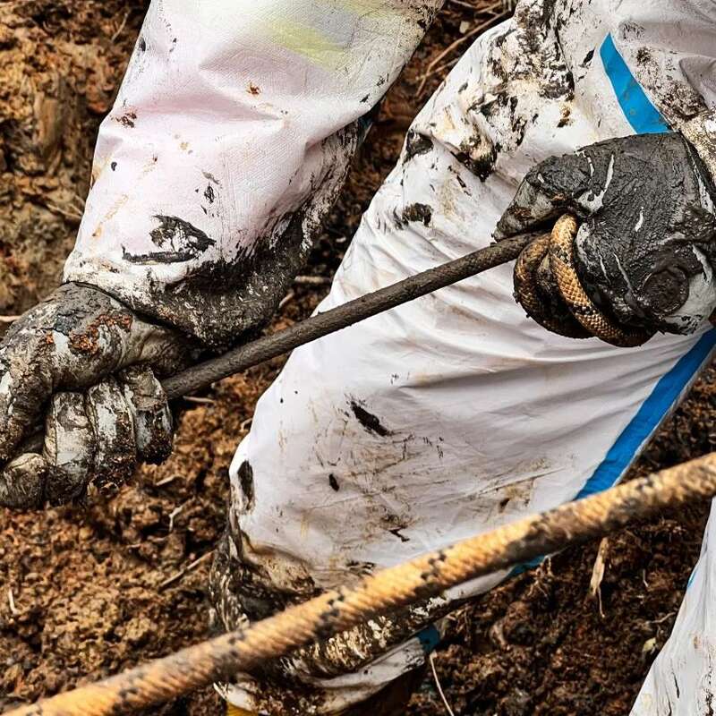 队长发现状况后,立马拽住我的安全绳,一发力就把我提了上来。回头看向泥潭,鞋子留在了里面。队长立刻向现场搜救人员发出提示,雨后泥土松软,务必注意脚下,做好安全防护。