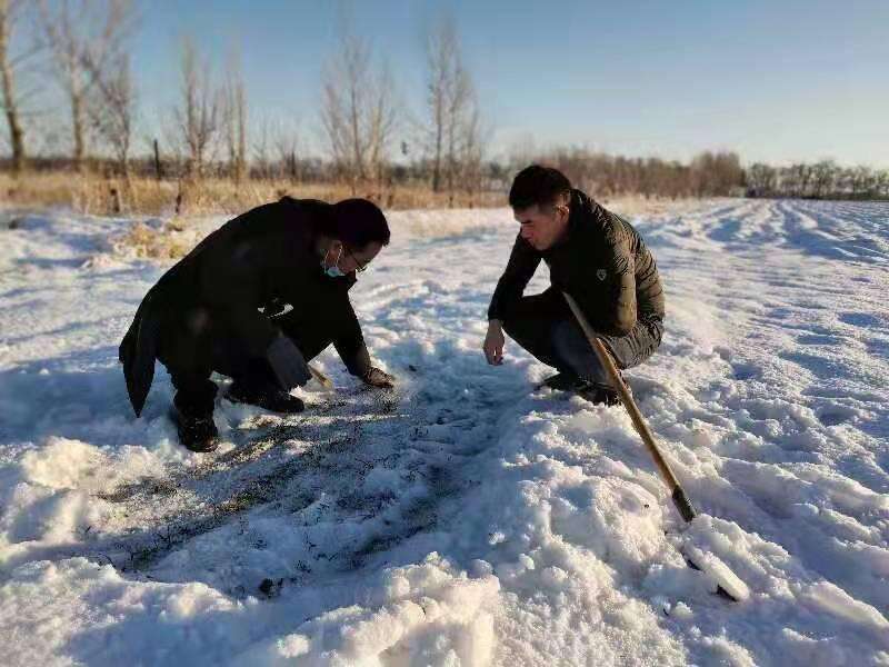 图为九师农(畜)科学研究所工作人员在冬小麦田查看返青和墒情情况(苟汇敏 摄)
