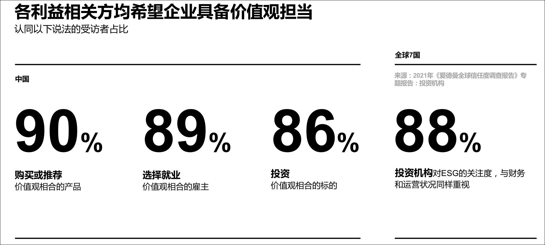 如今,人们都希望企业能够承担更多的社会责任,例如在气候变化、经济不平等、劳动力技能培训和种族歧视等议题。在中国,有90%左右的受访者表示会在购买产品、选择就业、进行投资时考虑企业的价值观。