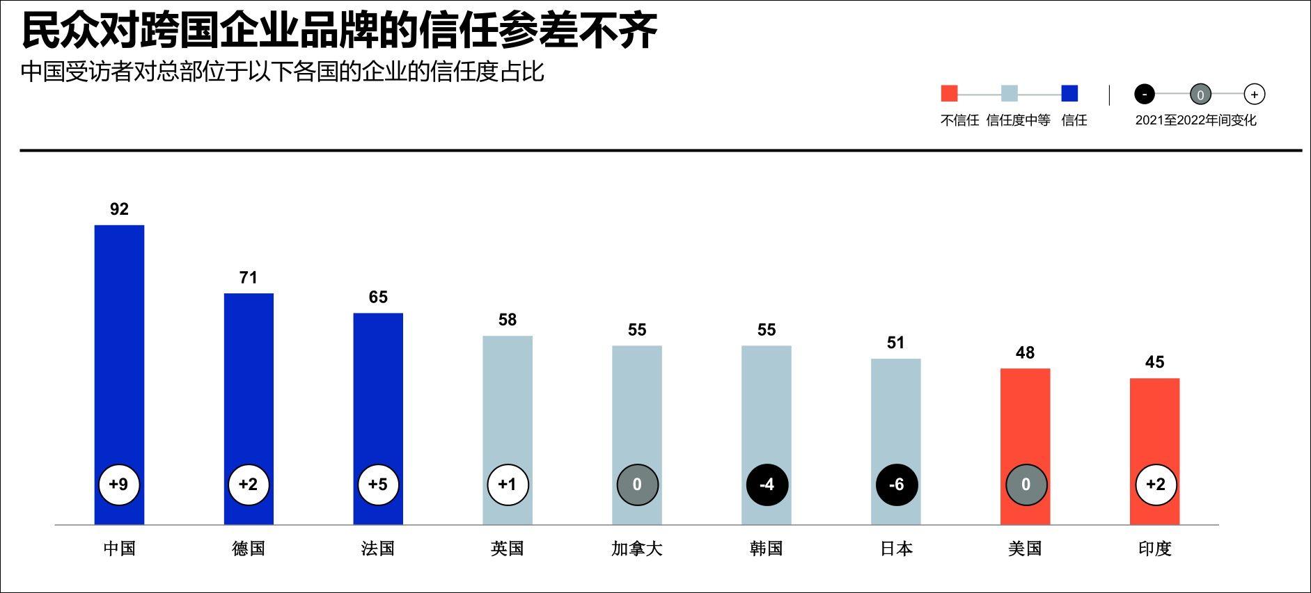 而在价值观方面,总部位于中国的企业有着先天的优势。报告显示,中国受访者这一年来对本土企业的信任有着不小的提升。相比之下,民众对跨国企业的信任参差不齐,尤其是总部位于美国和印度的企业,直接被划入“不信任”级别;总部位于韩国和日本的企业的信任得分也在下降,正在“不信任”的边缘徘徊;而德国和法国企业的得分相对较高,属于“信任”级。