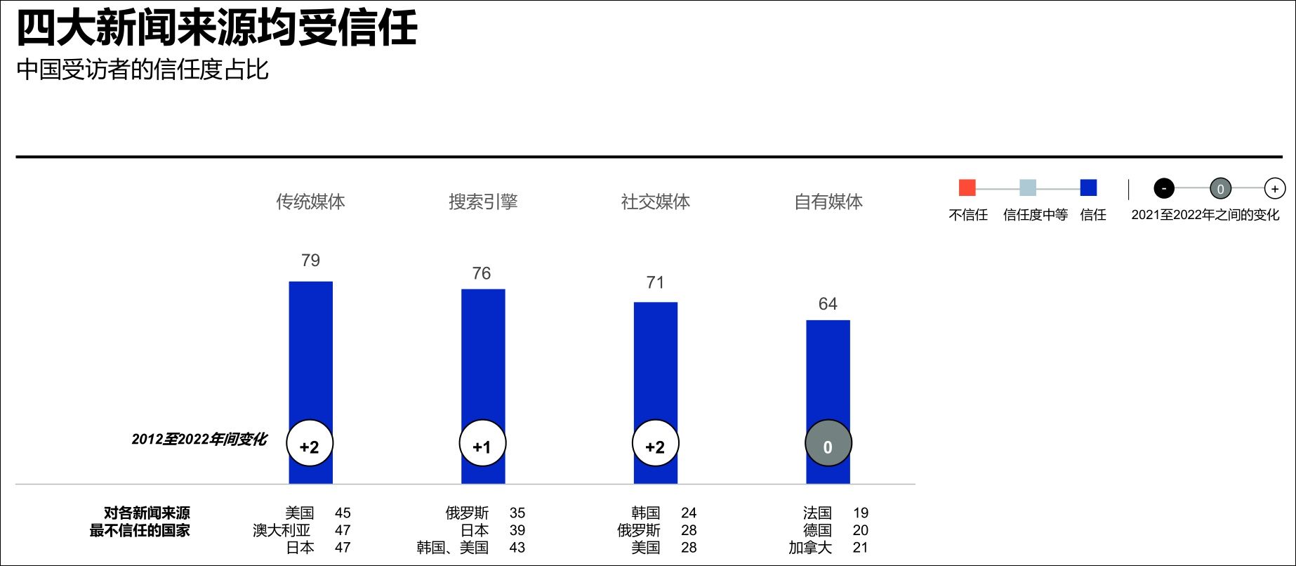 相比于西方发达国家和日本、韩国,中国受访者对媒体仍保持着较高的信任度。不过同其他国家受访者一样,中国人最信任传统媒体,最不信任自媒体。