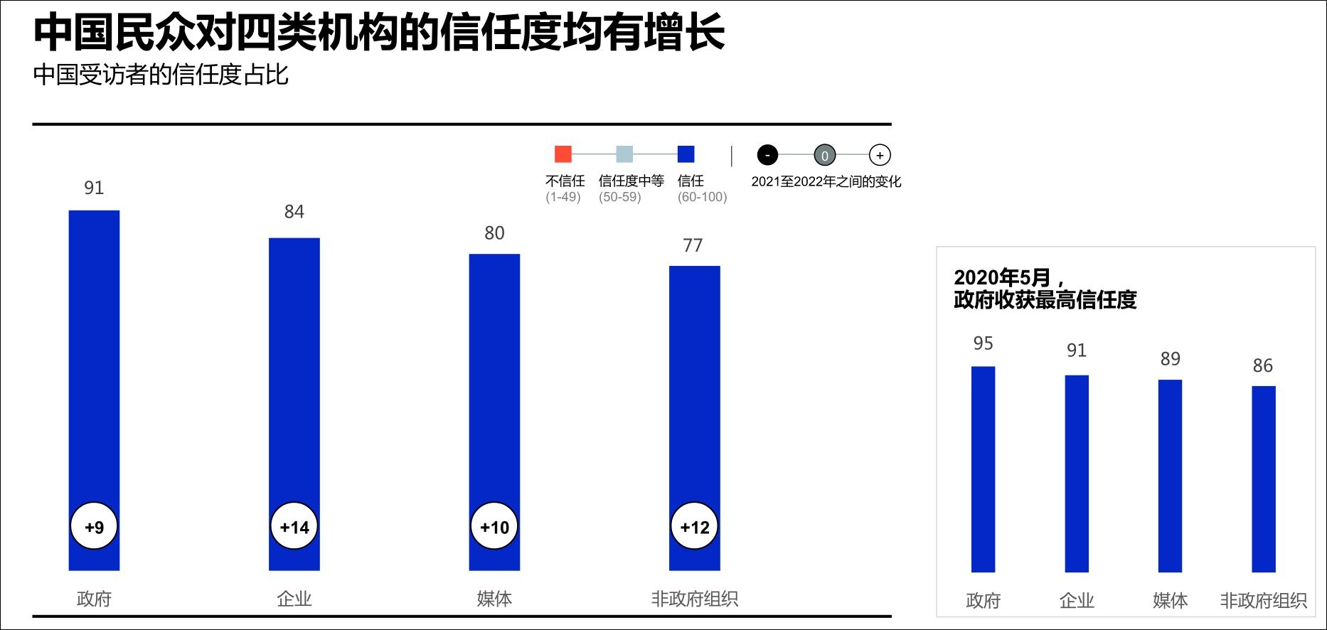 这份发布于3月30日的《2022年爱德曼全球信任度调查中国报告》聚焦后疫情时代民众对于政府、企业、媒体等机构的信任度状况。根据报告,在四类机构当中,中国民众对政府的信任分最高(91分),其次是企业(84分)、媒体(80分)、非政府组织(77分)。