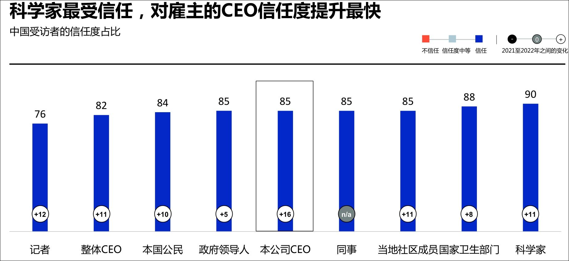 但如果脱离媒体这个圈子,就会发现中国受访者最信任的其实是科学家(90分),相对不信任记者(76分)。本公司CEO,也就是雇主的信任度在这两年提升最快。