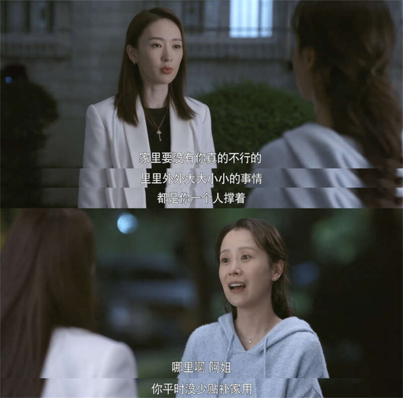 两个人对话都是互夸。顾清俞夸家里没了冯晓琴不行(潜台词:你别想搬出去住),冯晓琴嘴里亲切叫着阿姐,说你经常贴补家用(潜台词:奶奶爸爸都是我在照顾)。