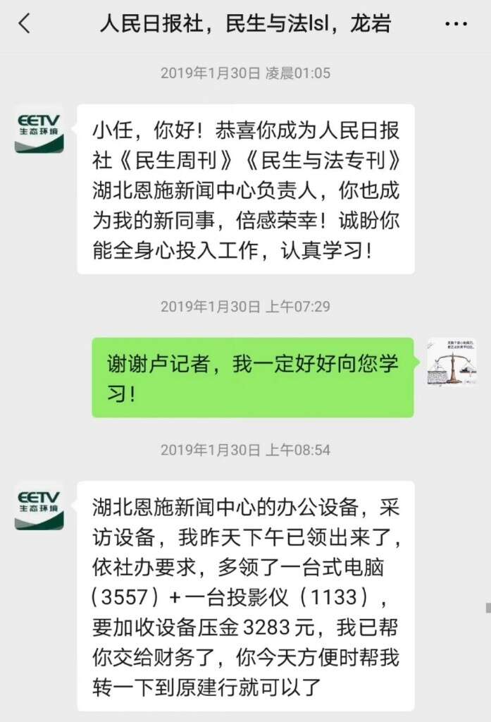 2018年8月1日,回到湖北老家的任本桃给卢绍龙发去个人简历,随后按卢的要求给他微信转账1080元,作为“工作证的制作费及工作押金”。8月16日,卢给任发微信说,“刚接报社通知,经杂志社研究决定,编委会同意,你于2018年9月起至2019年5月(作为)在湖北恩施编辑出版《魅力恩施》改革开放40周年专刊组稿负责人。为更好的(地)做好当地政府沟通协调和得到报社的积极配合,保证采编组稿编辑和按时(完成)发行工作,编委会拟预收取组稿保证金总费用的10%。我已答应社里下午先预付2万元给新闻编辑部,社里会在下个礼拜把任命书、工作证、文件、编辑方案等发给你。”当天,任给卢指定的银行个人账户汇款2万元。