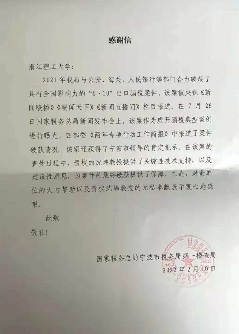 2月10日,国家税务总局宁波市税务局第一稽查局就沈炜教授协助破获“6·10”出口骗税案向浙江理工大学送上了感谢信。这让沈炜教授一时间受宠若惊,他表示“学习计算机专业既能掌握科技的魅力,又能感受服务社会的浪漫情怀。”