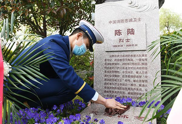 “陈陆,我们来看你了。”清明将至,陈陆生前的战友们来到陵园,擦拭着他的墓碑,表达着对他的思念之情。2020年7月22日,安徽合肥市庐江县消防救援大队政治教导员陈陆在执行庐江县连河村抗洪抢险任务中,突遇破圩决口后的激流漩涡,被洪水冲走,英勇牺牲,年仅36岁。
