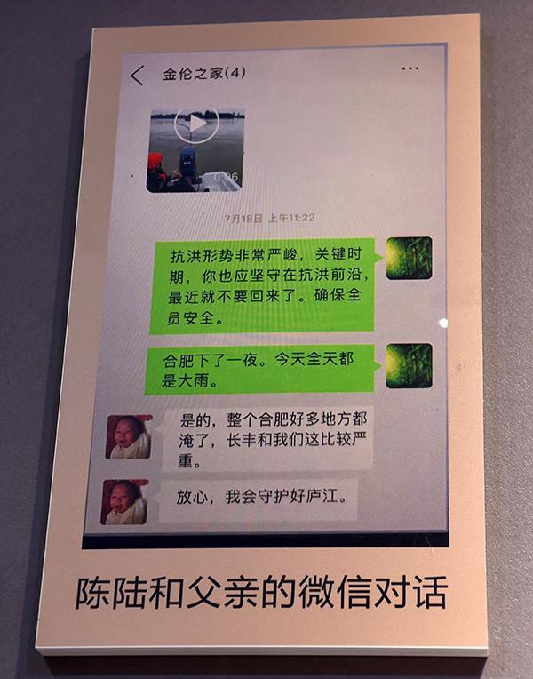 2020年7月18日,陈陆与父亲的对话。“抗洪形势非常严峻,关键时期,你也应坚守抗洪前沿,最近就不要回来了。确保全员安全。”2020年7月18日,陈陆的父亲给儿子发送了这条信息。陈陆回答了九个字:“放心,我会守护好庐江。”正是从7月18日起,庐江县同大镇政府开始动员并组织村民撤离。那段时间里,庐江县消防救援大队的报警电话一个接着一个,陈陆带着队员马不停蹄,与洪水赛跑。