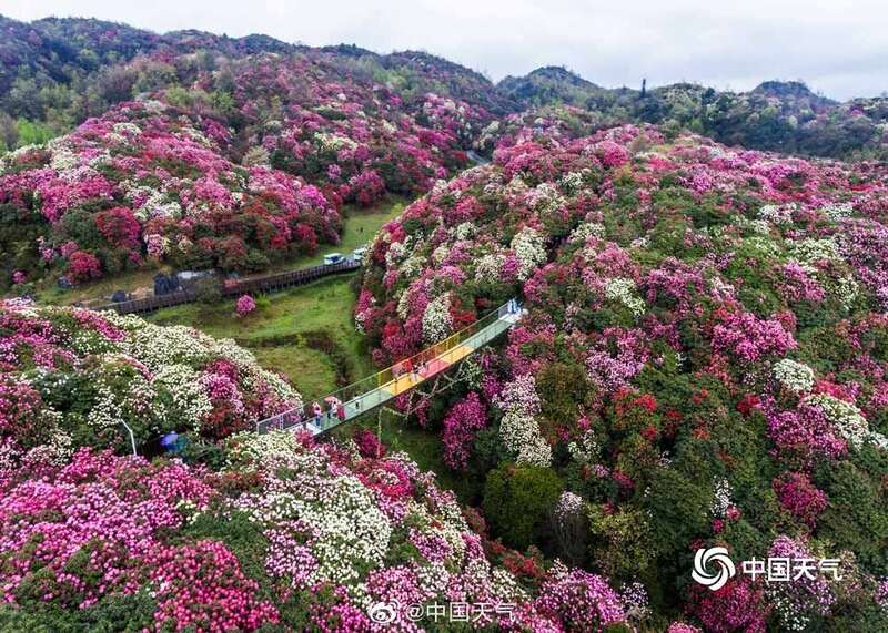 目前贵州、湖北、重庆等地的杜鹃花已经进入最佳观赏期。在北方,著名的杜鹃花观赏地青岛大珠山上,最早开花的杜鹃品种蓝荆子,也在3月底迎来了初花期,预计4月3日进入到盛花期,今年大珠山蓝荆子的开放时间较去年晚了一周,正好与清明假期撞了个满怀。