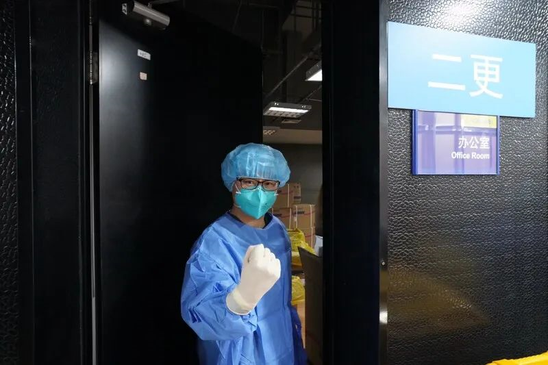 3月27日下午4时30分,经过33个小时的紧张准备,53位医疗队员正式进入世博展览馆临时集中隔离收治点H1区域工作,开始接收首批轻症患者及无症状感染者。