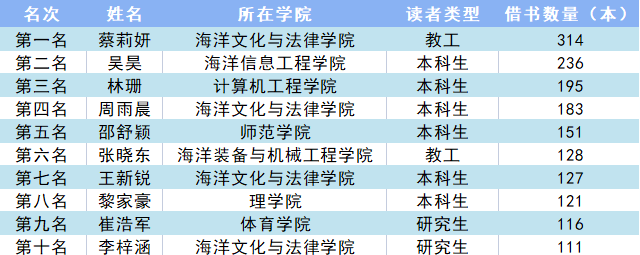 过去一年,师范学院(教师教育学院)的陈新颖进图书馆的次数高达911次。911次的进馆次数,听起来似乎并不是件容易的事。对此陈新颖表示,尽管自己不确定会在图书馆呆多久,但只要一下课,便会前往图书馆。她从大一起就常去图书馆,大三大四更加频繁。