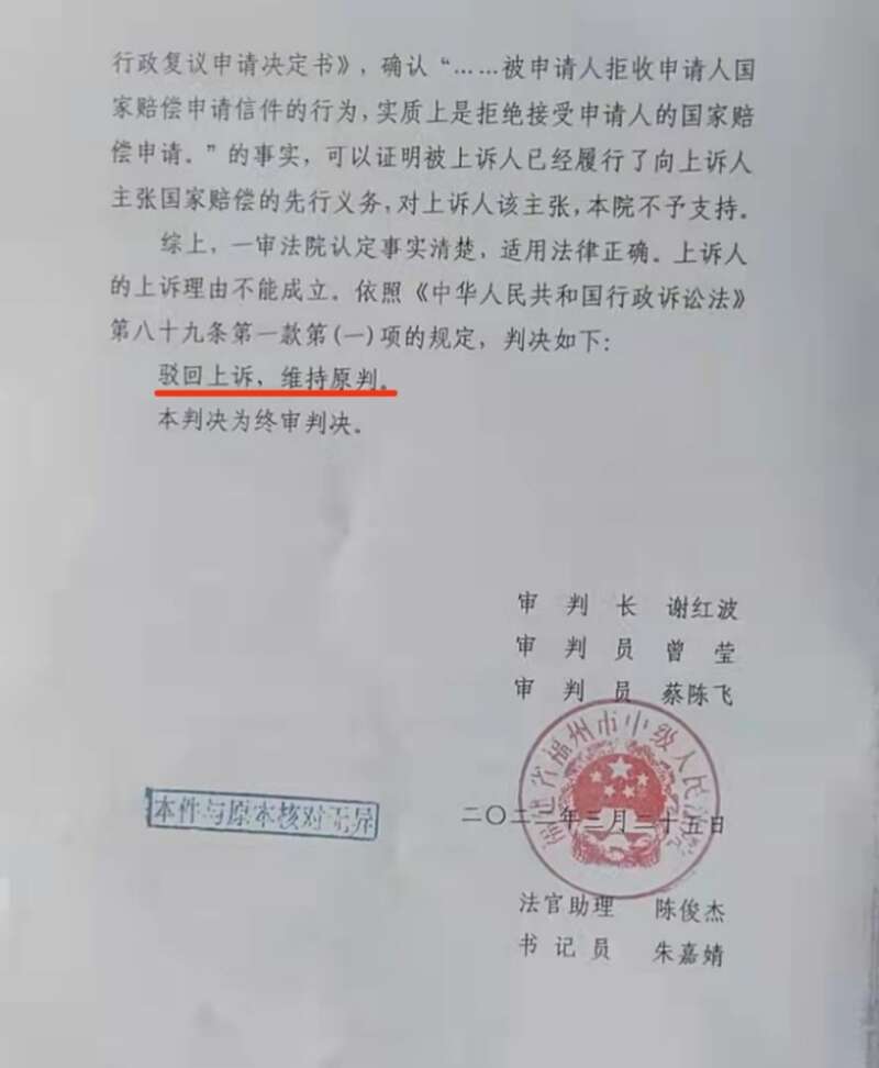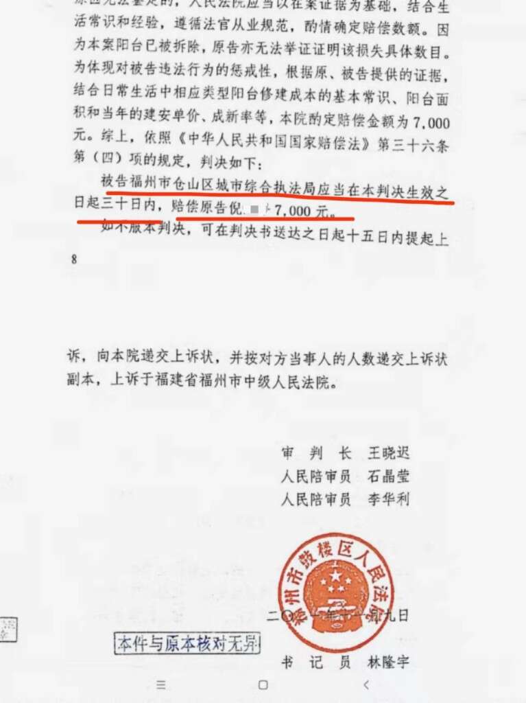 福州仓山城管不服一审判决,提起上诉。今年3月25日,福州市中级人民法院终审判决驳回上诉,维持原判。