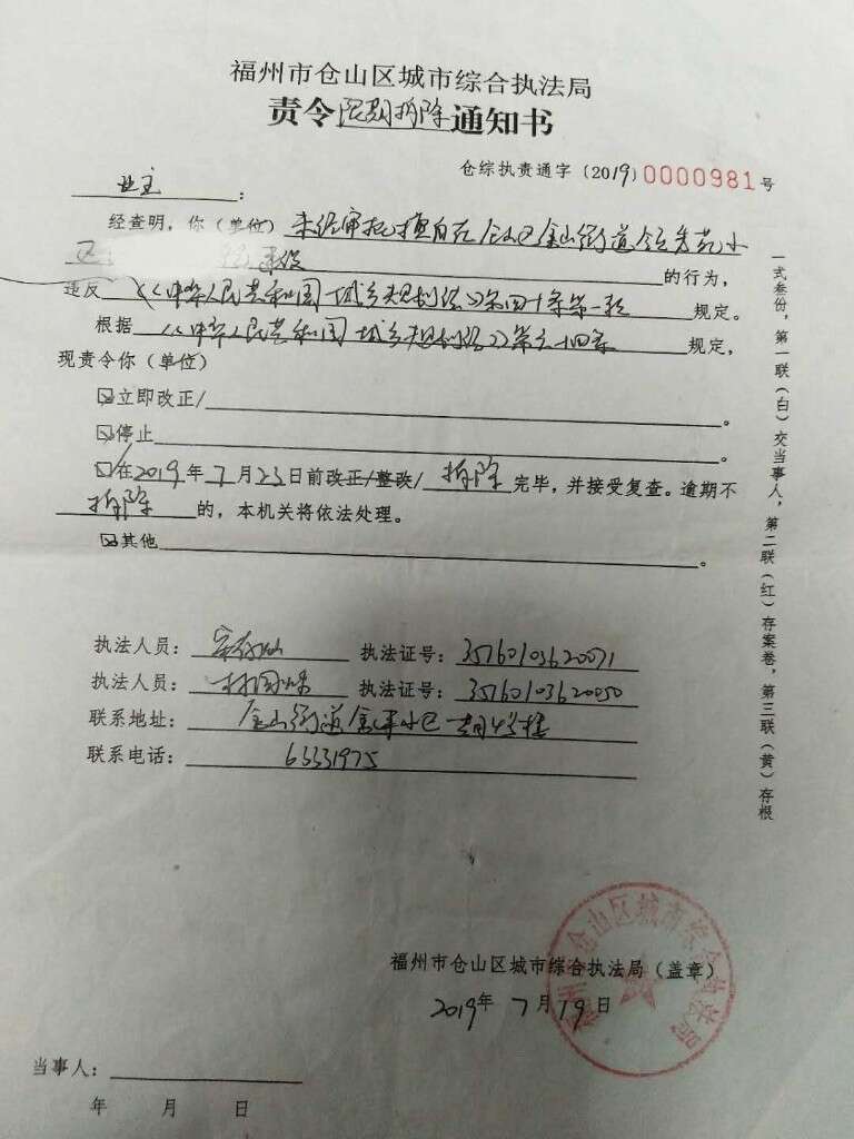 2019年7月19日,福州仓山城管将一纸《责令限期拆除通知书》张贴于倪家门上,责令于7月23日前自行拆除“违法建筑”。由于倪某拒绝拆除,仓山城管出函将该案移送至仓山区金山街道办事处组织强制拆除,并发文给福州市自来水公司、国网福州供电公司仓山供电服务中心,要求对倪家采取断水、断电措施。