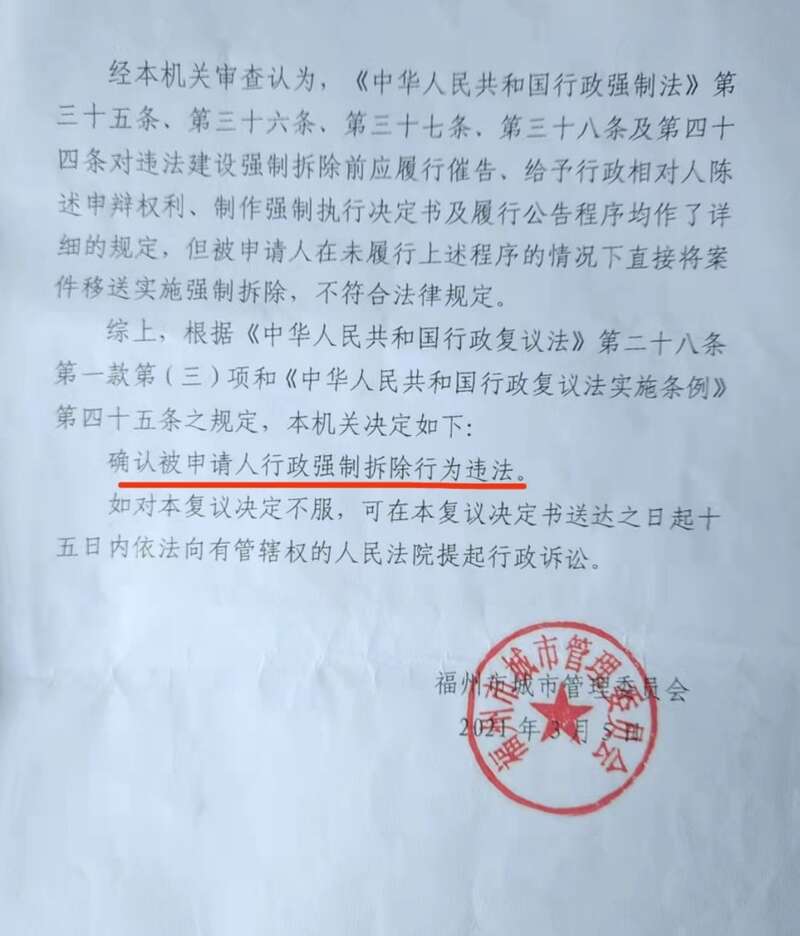 倪某认为强拆行为严重侵犯其合法权益,遂向福州市城市管理委员会申请行政复议。2021年3月5日,福州市城市管理委员会作出的《行政复议决定书》指出,《中华人民共和国行政强制法》的有关条款“对违法建设强制拆除前应履行催告、给予行政相对人陈述申辩权利、制作强制执行决定书及履行公告程序均作了详细的规定”,但福州仓山城管“在未履行上述程序的情况下直接将案件移送实施强制拆除,不符合法律规定”,据此确认其“行政强制拆除行为违法”。